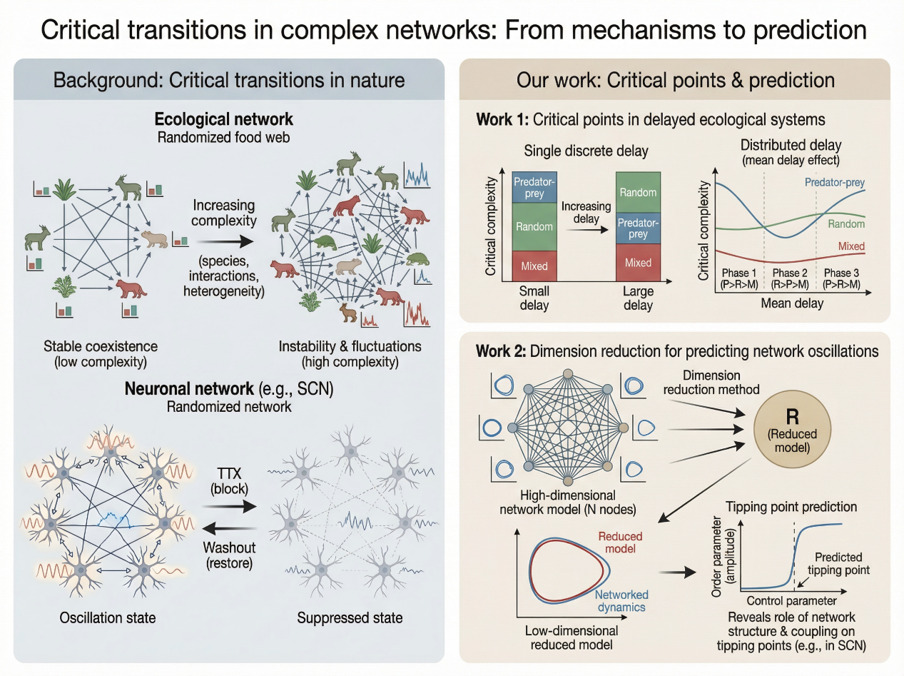 复杂系统功能涌现的临界点分析与预测:复杂系统功能通常在多尺度耦合和个体复杂的交互作用下涌现,准确地预测涌现临界点及其与系统关键参数、网络结构等重要属性间的关系有重要的科学价值。我们揭示了复杂生态系统由时滞诱导的稳定性新排序。此外,还建立了多时间尺度、复杂振荡系统的群体振荡涌现的分析框架和理论。(Physical Review Research 2023; PNAS Nexus 2025; SIADS 2026)